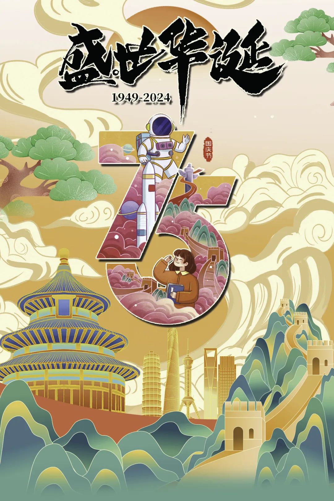 作品以慶祝中華人民共和國(guó)成立75周年為背景,展現(xiàn)了新中國(guó)在科技創(chuàng)新、提高人民生活水平等方面的重大成就。海報(bào)以祥云為背景,加入宇航員元素,象征著中國(guó)航天的輝煌成績(jī)。通過展示現(xiàn)代城市的標(biāo)志建筑,傳遞出祖國(guó)的繁榮與昌盛,同時(shí)保留了傳統(tǒng)建筑,體現(xiàn)中華文化的傳承與發(fā)展。海報(bào)整體設(shè)計(jì)既具有現(xiàn)代感,又不失傳統(tǒng)韻味,展現(xiàn)了一幅國(guó)家繁榮昌盛、人民幸福安康的生動(dòng)畫卷。