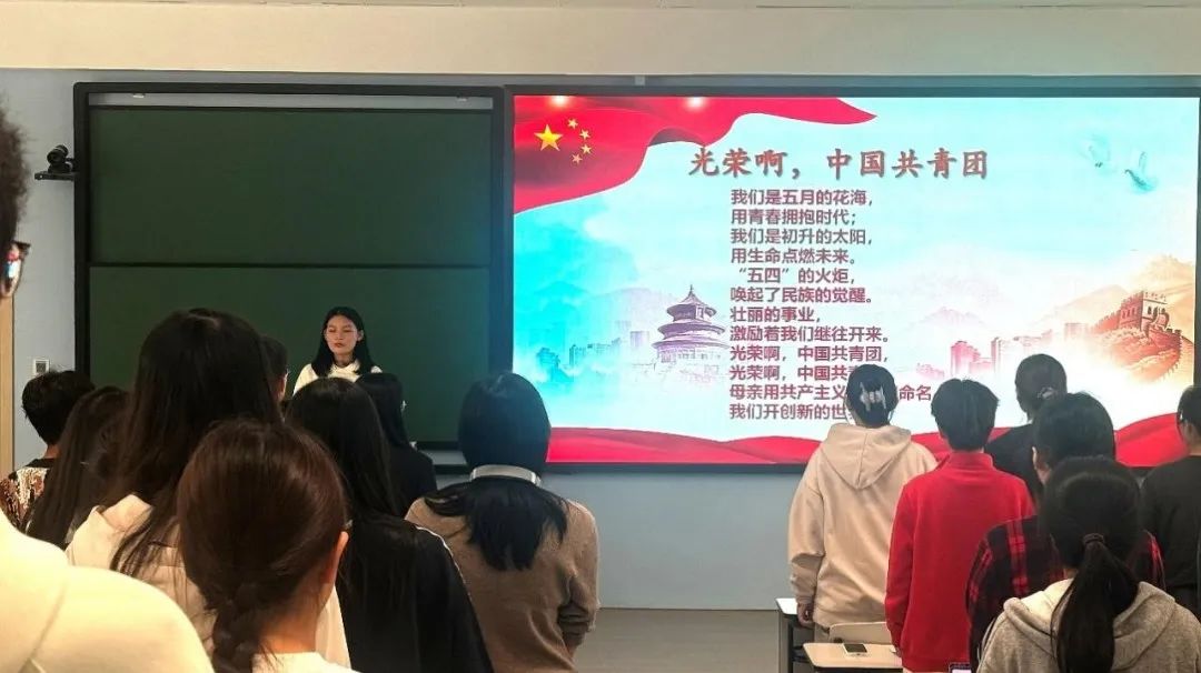 在主持人石蕊婷同學的帶領下,全體師生齊唱中國共產主義青年團團歌《光榮啊,中國共青團》,歌聲嘹亮,情緒高昂。