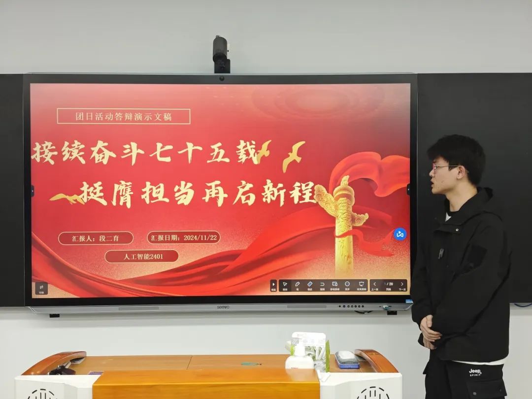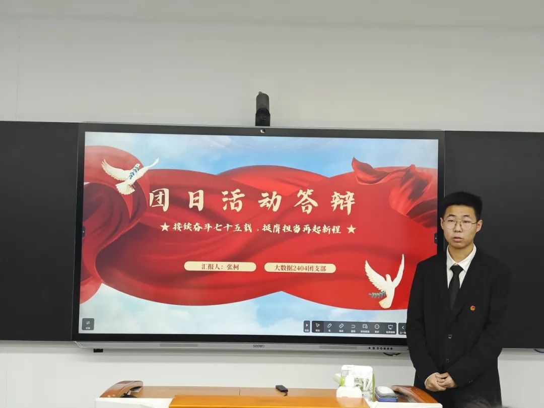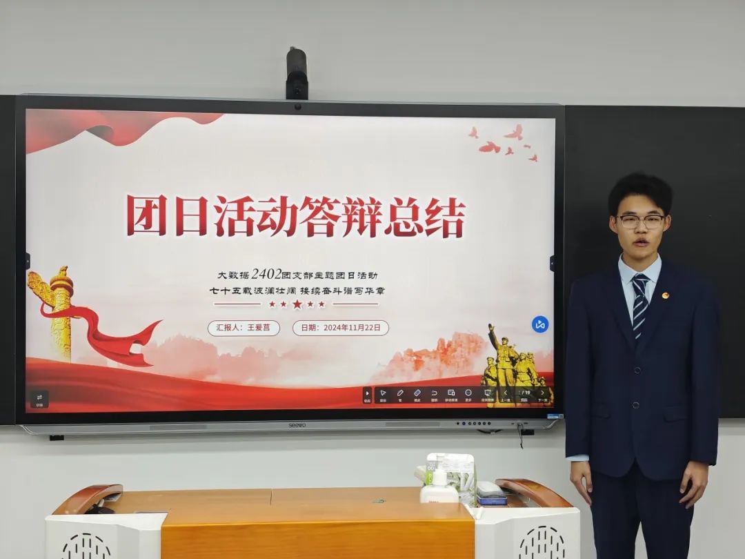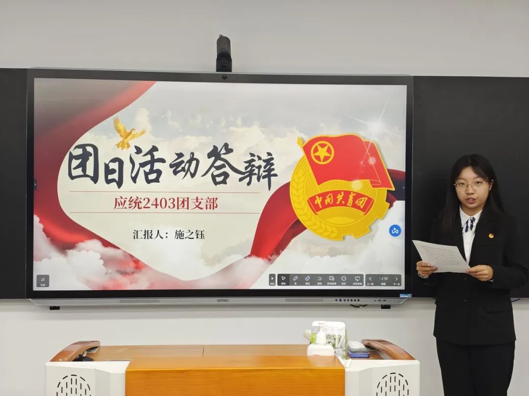 在主持人介紹答辯流程及規則后,答辯正式開始。參與答辯的27位團支部書記按照順序依次上臺展示匯報。過程中,各位團支書詳細介紹了所在團支部團日活動的開展情況,充分體現了豐富多樣的創意文化作品與開展過程中取得的成果經驗。紅色文創、知識問答、紅色劇本殺、實地尋訪手帳宣傳海報、奮斗感悟、主題精講團課、團支部共建回顧,公眾號視頻號運營,這些充實的成果內容彰顯出每一個團日活動背后團支部書記與全體團支部成員的辛勤付出與協作精神。