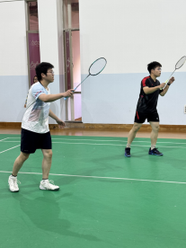 第三場為男子雙打比賽,我方參賽選手為戴子豪同學與王徐睿同學。比賽一開始,二人的配合出現了些許小失誤,讓對手抓住了得分的機會。但二人迅速調整,展現出了十足的默契,攻守有序,在比分上占據了一定優勢。隨著比賽進入白熱化,二人發揮穩定,最終以21:16的大比分,贏得了本場比賽的勝利。