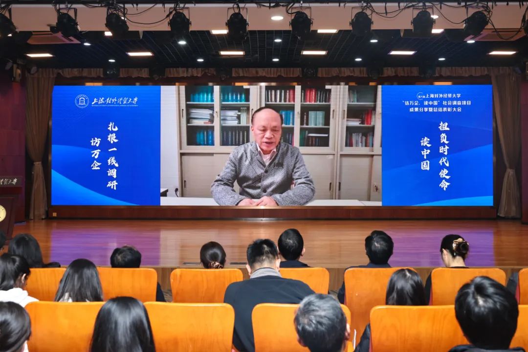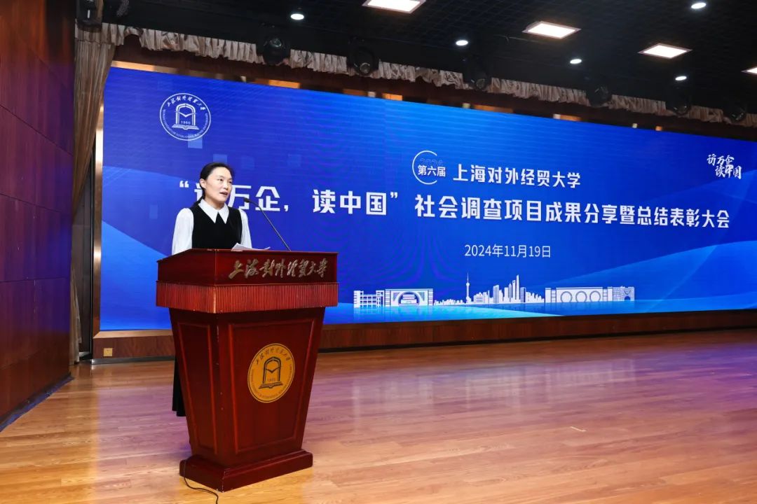 11月19日,上海對外經(jīng)貿(mào)大學2024年“訪萬企,讀中國”社會調(diào)查項目成果分享暨總結(jié)表彰大會在松江校區(qū)信息樓507報告廳順利舉行。上海對外經(jīng)貿(mào)大學副校長徐永林,校黨委常委、宣傳部部長郭茜,“訪萬企,讀中國”社會調(diào)查項目顧問、統(tǒng)計與信息學院原院長劉永輝,教務處處長朱建明,黨委學(研)工部部長、學生處處長繆韻笛,統(tǒng)計與信息學院黨委書記黃靜,團委書記司徒力云,國際經(jīng)貿(mào)創(chuàng)新與治理研究院副院長張海娜,各學院團組織負責人,項目師生代表及統(tǒng)計與信息學院大一新生共400余人出席。會議由統(tǒng)計與信息學院副院長王利娟主持。