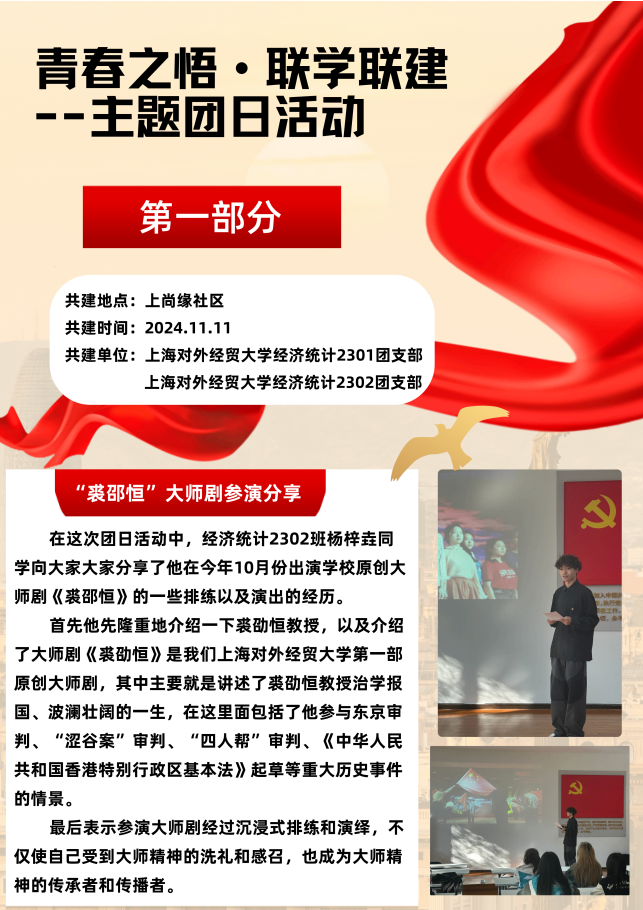 活動(dòng)內(nèi)容:經(jīng)統(tǒng)2302團(tuán)支部、經(jīng)統(tǒng)2301團(tuán)支部的同學(xué)在社區(qū)工作人員的帶領(lǐng)下進(jìn)行社區(qū)清潔,隨后前往社區(qū)黨群服務(wù)中心,由經(jīng)統(tǒng)2302團(tuán)支部楊梓垚同學(xué)講述其參演上海對(duì)外經(jīng)貿(mào)大學(xué)原創(chuàng)大師劇《裘劭恒》的經(jīng)歷和見聞。