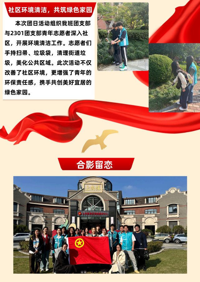 活動(dòng)內(nèi)容:經(jīng)濟(jì)統(tǒng)計(jì)2302團(tuán)支部與經(jīng)統(tǒng)2301團(tuán)支部的成員們一同前往上尚緣社區(qū),參與社區(qū)環(huán)境清潔志愿服務(wù)活動(dòng)。在社區(qū)工作人員的安排下被分成若干小組,各自負(fù)責(zé)不同區(qū)域的清潔工作,走遍社區(qū)每個(gè)角落,包括街道、綠化帶、廣場等公共區(qū)域,認(rèn)真清理垃圾和雜物,確保每個(gè)區(qū)域都干凈整潔。