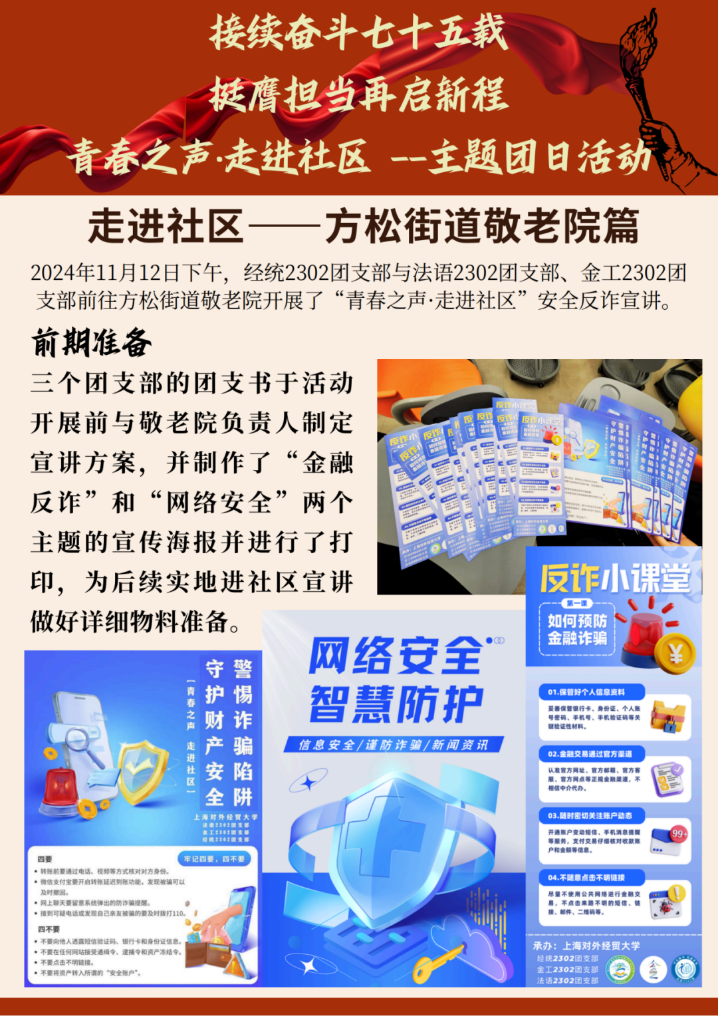 活動(dòng)內(nèi)容:三支部成員前往松江區(qū)方松街道敬老院,在工作人員的帶領(lǐng)下,進(jìn)入敬老院內(nèi)部開展“金融反詐”和“網(wǎng)絡(luò)安全”兩系列的宣傳講座,并設(shè)計(jì)制作了系列海報(bào)分發(fā)給敬老院內(nèi)的老年人。