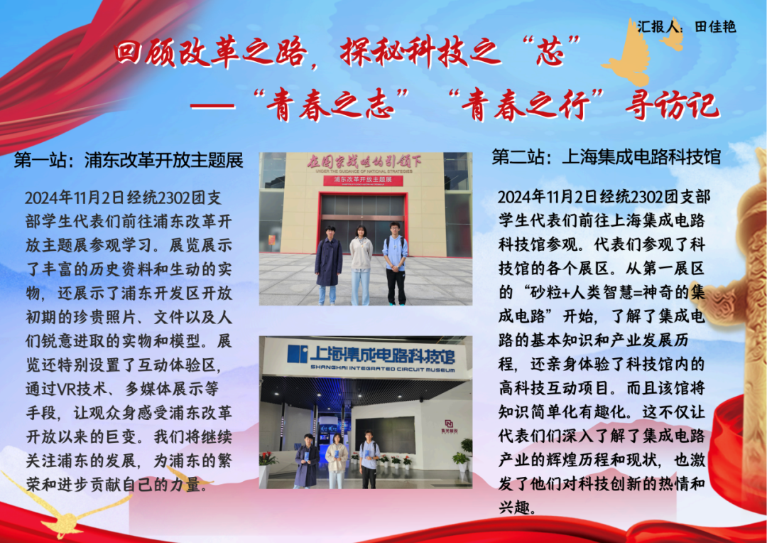 為了讓每位團(tuán)支部的同學(xué)都能有效參與尋訪活動(dòng)并深入地了解國家芯片等方面的科技發(fā)展歷程以及與本專業(yè)對(duì)應(yīng)的未來發(fā)展。本支部于2024年11月開展了“青春之行·實(shí)地尋訪”科技尋訪活動(dòng),由代翊群、王子洋、詹皓丞三人組成紅色尋訪小分隊(duì),進(jìn)行上海集成電路科技館實(shí)地走訪學(xué)習(xí)。其余團(tuán)支部同學(xué)根據(jù)團(tuán)日活動(dòng)官方的尋訪二維碼進(jìn)行了線上的參觀學(xué)習(xí)并制作了尋訪筆記。