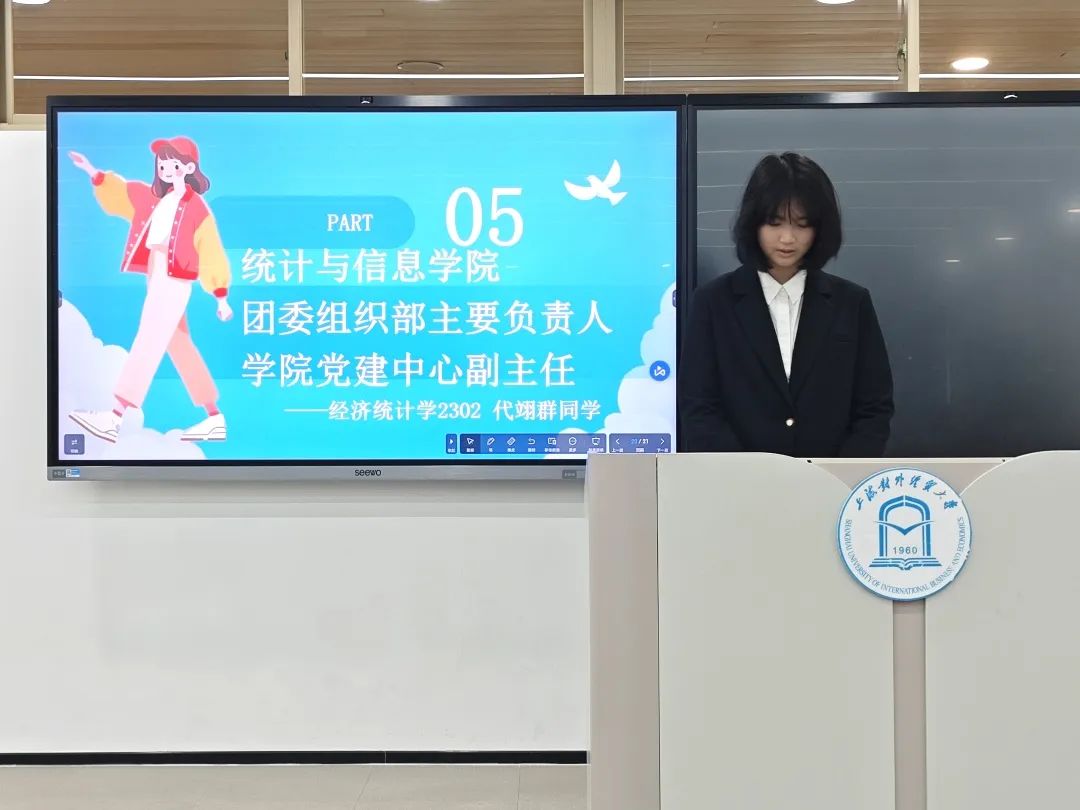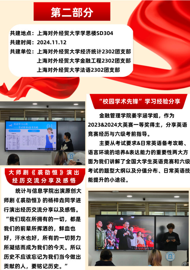 活動(dòng)內(nèi)容:姜宇涵學(xué)姐作為2023&2024大英賽一等獎(jiǎng)得主,分享英語競賽經(jīng)歷與六級(jí)考前指導(dǎo);出演原創(chuàng)大師劇《裘劭恒》的經(jīng)統(tǒng)2302團(tuán)支部楊梓垚同學(xué)進(jìn)行演出經(jīng)歷交流分享以及感悟;國際刑事模擬法庭成員陳思羽座談交流競賽經(jīng)歷;梁奕然學(xué)長分享作為優(yōu)秀志愿者及2024進(jìn)博會(huì)小葉子的感悟;統(tǒng)信學(xué)院院團(tuán)委組織部部長、院黨建促進(jìn)中心副主任代翊群總結(jié)發(fā)言。
