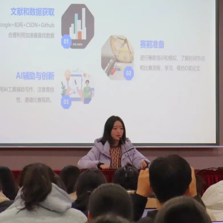 首先,劉海老師分享了我校近幾年來在美賽中取得的優異成績,告訴大家競賽的收獲,鼓勵大家積極報名參賽。其次,老師強調了提高獲獎概率的方法,建議大家抓緊利用寒假的時間,認真學習知識準備比賽,正確使用推薦的書籍和網站資料。最后,老師特別提醒同學們不得購買或抄襲其他論文。