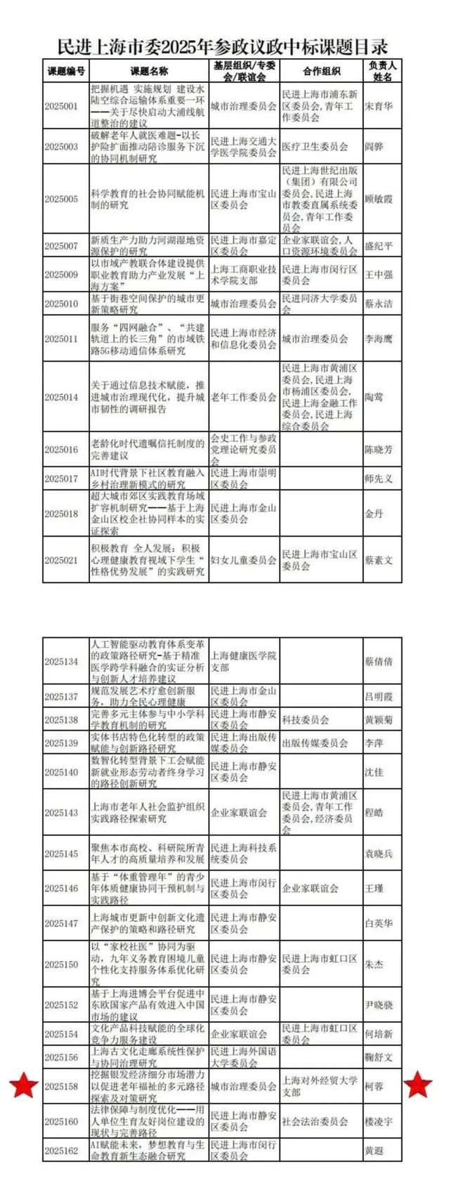 今年,民進上海市委參政議政課題招投標工作于3月啟動。市委會深入學習貫徹習近平新時代中國特色社會主義思想,貫徹落實中共二十屆三中全會精神,圍繞民進中央、市委會2025年度重點工作,堅持突出界別特色、堅持“兩個融入”,制定《2025年民進上海市委參政議政課題指南》,提出年度重點選題方向,并于上海民進微信公眾號、網站進行在線發布。