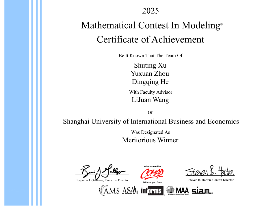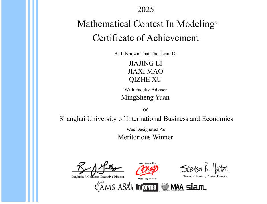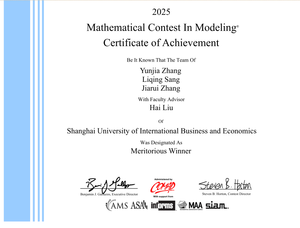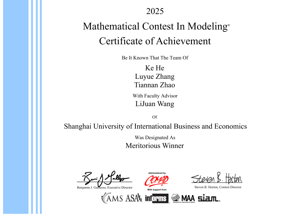 近日,2025年美國大學生數學建模競賽(MCM/ICM)成績揭曉,我校學生再創佳績,榮獲國際一等獎4項(Meritorious獎),國際二等獎16項(Honorable獎),國際三等獎86項(Successful獎)。