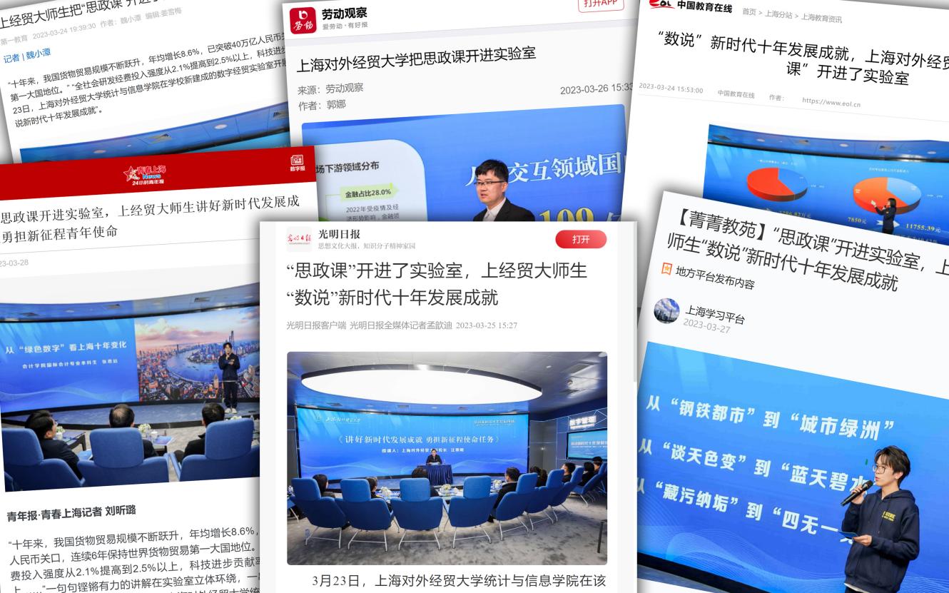 上海對外經貿大學“數說黨史 數說中國”系列活動具有鮮明的學科特色和時代特征,師生運用數據挖掘和數據分析方式,講黨史、讀中國、學思想、強擔當。“數說二十大”系列宣講開設《數說中國共產黨發展歷程》《數說新時代中國青年》《數說脫貧攻堅》《數字里的鄉村振興》等10個系列課程,把黨的二十大精神全面融入學科專業、教育教學全過程?!皵嫡f新時代十年發展成就”由師生在學校數字經貿實驗室里共上《數說貿易強國建設》《數說創新驅動發展》等思政課程,以大量的數據、圖表和分析對比,把新時代十年偉大變革和發展成就融入思政教育,讓課程更有說服力,讓師生更有“共鳴”、能“共情”。師生宣講團在上海市教衛工作黨委第三季“偉大工程”示范黨課上為全校師生授課“數說三件大事”,把習近平總書記在黨二十大報告中總結的“新時代十年來中國共產黨經歷的三件大事”數據化、可視化,讓二十大精神更抵達人心。青年報要聞版以《把“真理的味道”送進校園》為題,專題報道學院“數說”系列宣講活動。