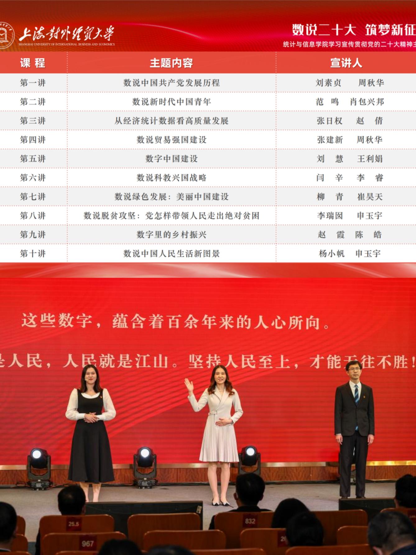 未來,上海對外經貿大學統計與信息學院將進一步凝練“黨史+學科”特色教育模式,在“數字化”上下功夫,打造最契合師生需求的學習教育新路徑和新模式,讓理論學習教育更有深度、更顯特色、更出實效,切實做到學思想、強黨性、重實踐、建新功;二是“緊扣時代脈搏+聚焦師生實際”,注重內容精準供給,不斷優化“數說”系列課程體系、活動機制,打造成為具有影響力的精品項目;三是“做強師資+做大陣地”,打造卓越宣講團隊伍,強化理論學習、增強備課效果、提升宣講水平,廣泛搭建校內外共建合作平臺,與中共四大紀念館、松江區廣富林街道黨工委、中國電信上海公司黨委、中小學等單位開展合作共建,推動“數說”系列活動走出校園、深入田間地頭、街道社區、大中小學課堂、經濟社會建設主戰場去宣講,輻射更廣泛的群體,凝聚起更大的奮進力量。
