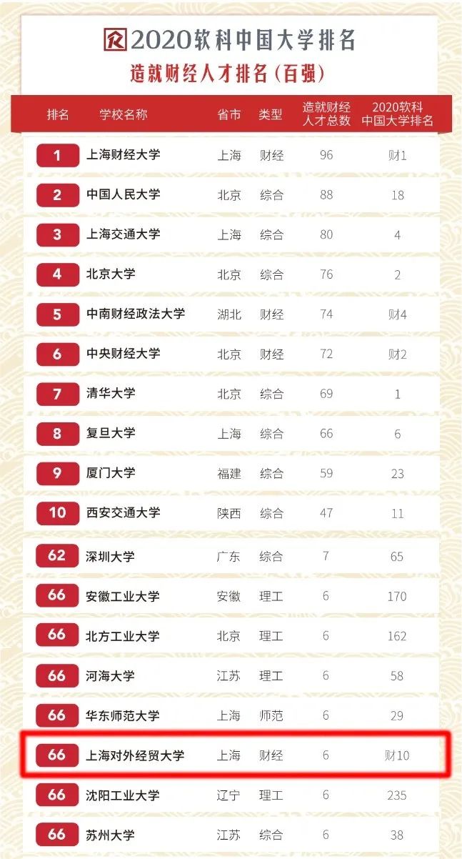 2020軟科中國(guó)大學(xué)造就財(cái)經(jīng)人才排名把截至2019年10月在現(xiàn)任全球主要交易所主板上市的企業(yè)財(cái)務(wù)負(fù)責(zé)人和金融類(lèi)企業(yè)負(fù)責(zé)人的本碩博畢業(yè)學(xué)校人數(shù),作為此次排名的參考。在這份榜單中,有近70所高校是“雙一流”高校,我校能在榜單中排名66位凸顯了學(xué)校在財(cái)經(jīng)人才培養(yǎng)方面的獨(dú)特優(yōu)勢(shì)和顯著成果。