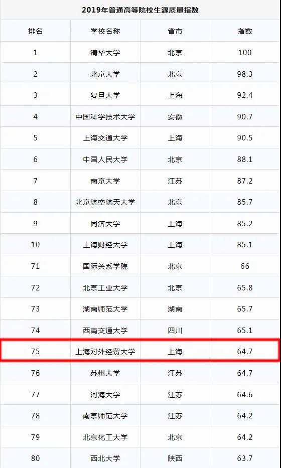 中國(guó)大學(xué)生源質(zhì)量排行榜根據(jù)內(nèi)地高校與各省市錄取分?jǐn)?shù)最低分和平均分統(tǒng)計(jì),統(tǒng)籌考慮提前批次、所在地區(qū)生源等影響因素,科學(xué)計(jì)算得出。入選生源質(zhì)量百?gòu)?qiáng)的絕大多數(shù)為“雙一流”高校,僅15所非“雙一流”高校上榜,我校位列第9名。