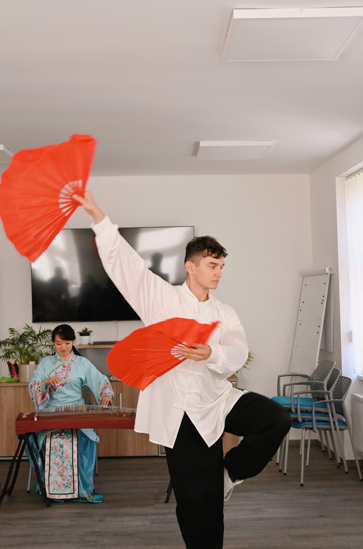 海外志愿者狄小倩與中國武術愛好者大衛共同為大家展現了中國傳統音樂和武術的獨特之美。狄小倩向員工們介紹了古箏的歷史淵源和文化內涵,并現場演奏了一曲《漁舟唱晚》,大衛伴隨樂曲表演太極扇,獲得了熱烈反響。員工們還跟著大衛練習太極,從中體會到了專注與放松的美妙平衡。