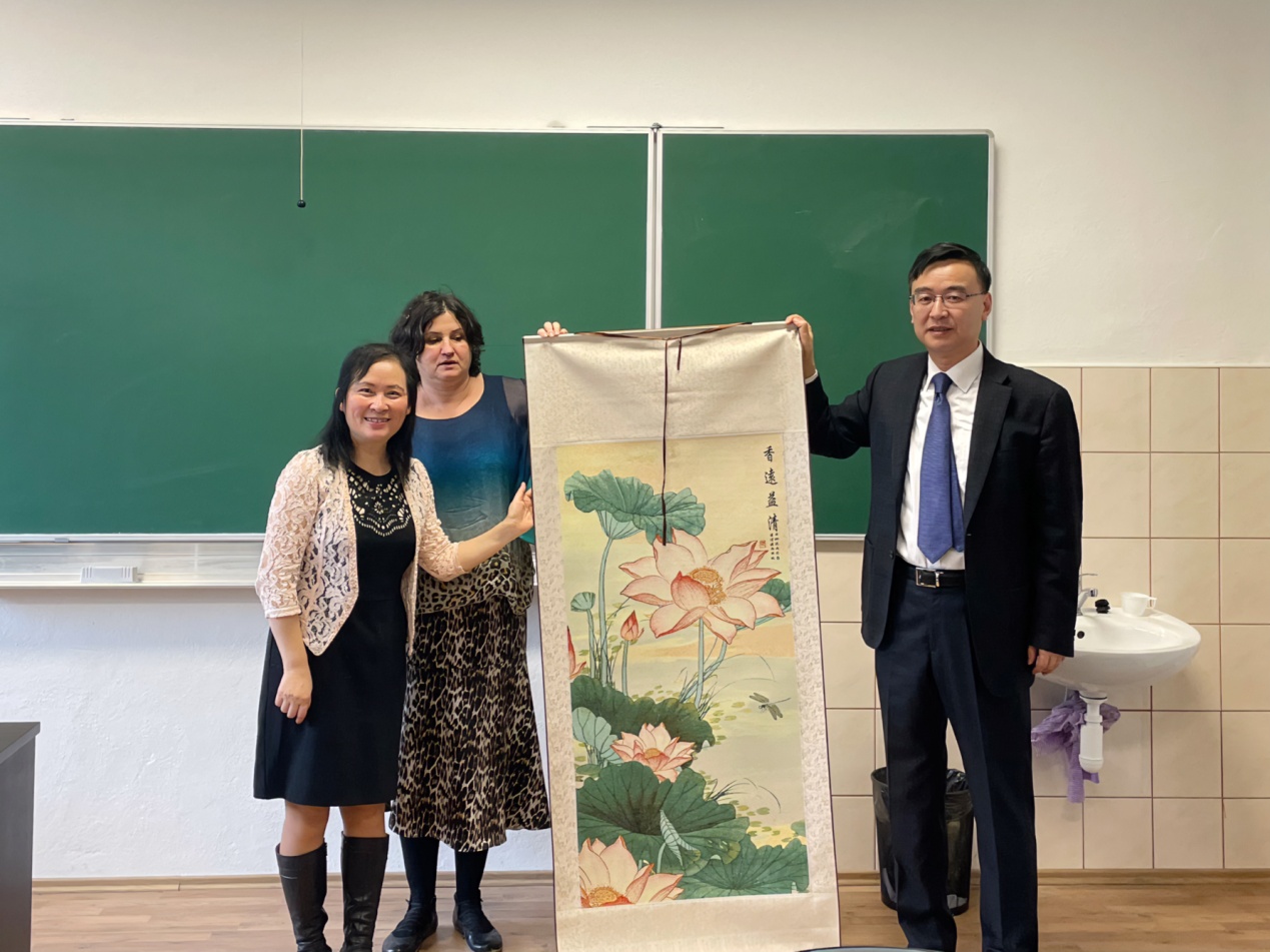 1020日,中國駐斯洛伐克大使蔡革一行蒞臨斯洛伐克考門斯基大學孔子學院(以下簡稱考大孔院)。考大孔院外方院長貝雅娜、中方院長葉蓉、辦公室主任Dana以及考大孔院教師代表組織座談會熱情迎接了蔡革大使的來訪。