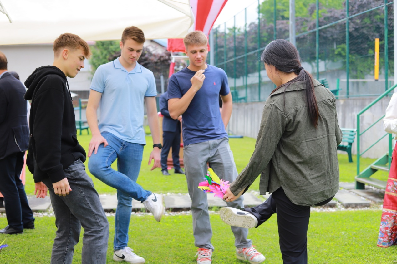 布雷佐瓦奇科格中學師生們在參觀完大使館后,觀看了薩大孔院教師們表演的舞獅、古箏、太極扇、新疆舞等節目。此外,薩大孔院還開展了傳統文化體驗工作坊,從書法、剪紙和圍棋,到穿漢服、用筷子、踢毽子和射藝,以及熱氣球VR游上海,從多個角度展現了深厚的中國傳統文化,讓中學師生們樂在其中。