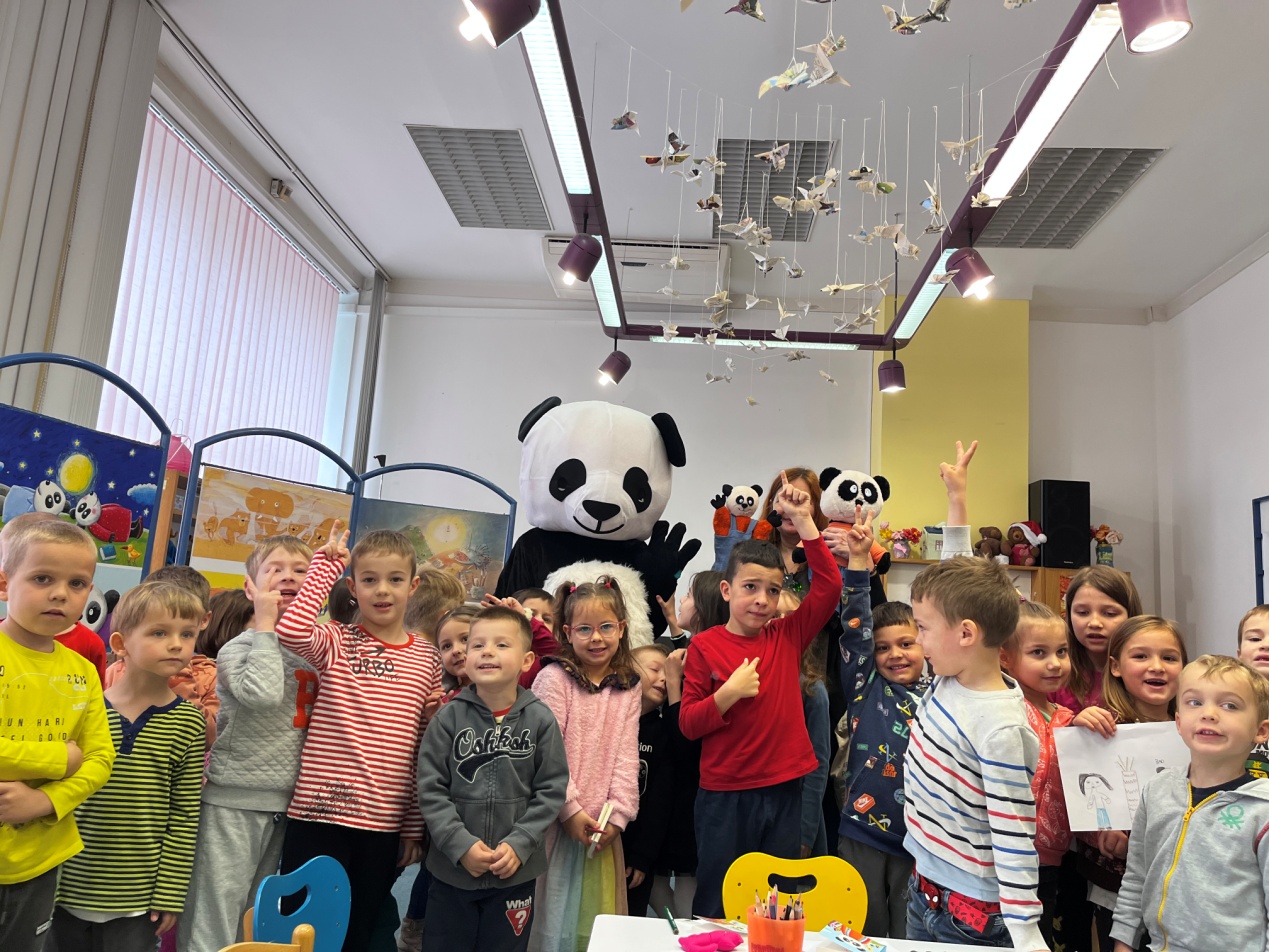 工作坊一開始,熊貓主題中克雙語繪本《我是嘟寶》的圖作者——克羅地亞插畫家安德里亞?帕特麗珂向小朋友們講述了嘟寶和嘟寶一家的故事。薩大孔院公派教師楊夢婕配合故事情節,選取其中的基礎中文詞匯,進行了中文教學。現場的小朋友們全神貫注的聽講并認真跟讀。在接下來的手繪環節中,小朋友們各自拿起畫筆,畫出自己心中的熊貓形象。薩大孔院公派教師孫慧敏和熊貓人偶的驚喜登場將活動推向了高潮,小朋友們爭先恐后與熊貓人偶打招呼說“你好”,并向熊貓人偶展示自己畫的熊貓。
