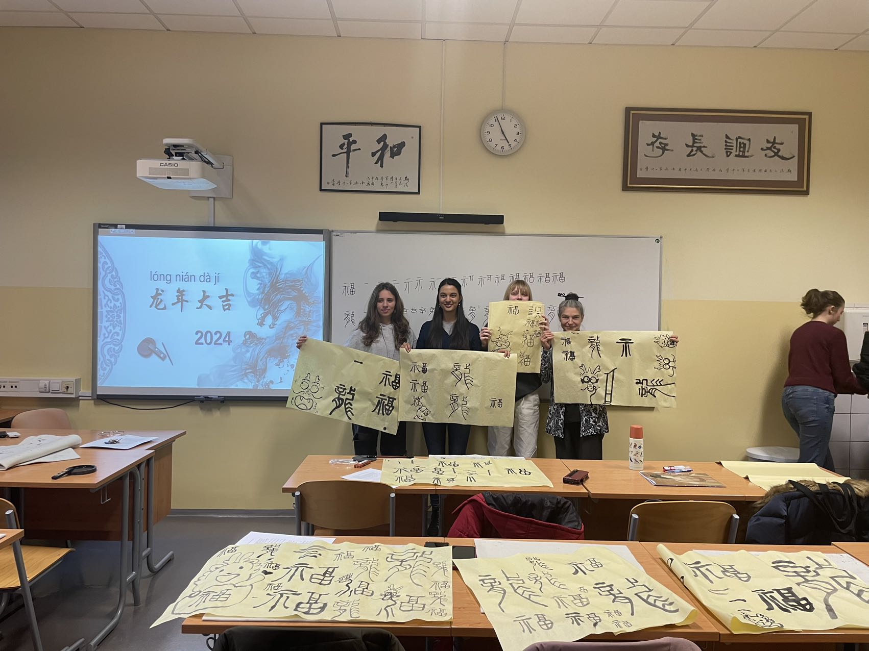 活動現(xiàn)場,漢學(xué)家Mojca Selijak和公派教師劉影向?qū)W生們介紹了中國春節(jié)、十二生肖以及中國龍的文化知識。學(xué)生們揮動毛筆書寫漢字,體驗剪紙,品嘗香茗。