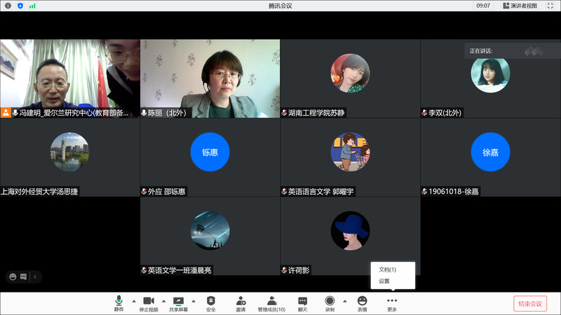 本次講座由我院愛(ài)爾蘭研究中心主任馮建明教授主持,先后有來(lái)自北京外國(guó)語(yǔ)大學(xué)、北京第二外國(guó)語(yǔ)學(xué)院、湖南工程大學(xué)、河北建材職業(yè)技術(shù)學(xué)院和我校教師共31名線上聽(tīng)眾。陳麗教授的發(fā)言得到了聽(tīng)眾的積極響應(yīng)。聽(tīng)眾對(duì)陳麗教授表達(dá)了誠(chéng)摯感謝。陳麗教授的講座為我校60周年校慶增添了光彩,推動(dòng)了我校愛(ài)爾蘭學(xué)科建設(shè)和外國(guó)語(yǔ)言學(xué)及應(yīng)用語(yǔ)言學(xué)碩士學(xué)位點(diǎn)發(fā)展,讓線上師生對(duì)文學(xué)與文化研究受到各種啟發(fā)。