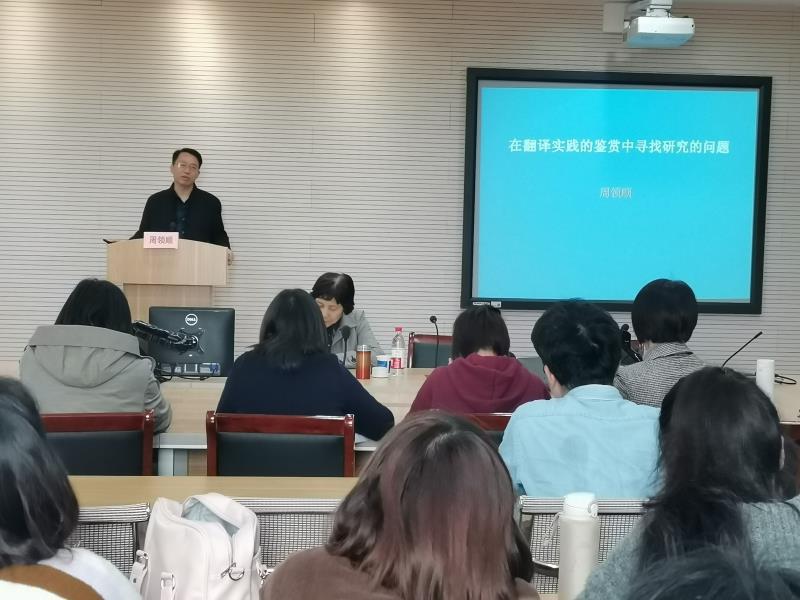 4月2日下午,揚(yáng)州大學(xué)翻譯行為研究中心主任周領(lǐng)順教授應(yīng)邀來(lái)我院做了一場(chǎng)題為《在翻譯實(shí)踐的鑒賞中尋找研究的問(wèn)題》的專(zhuān)題學(xué)術(shù)報(bào)告。報(bào)告會(huì)由楊翠萍副院長(zhǎng)主持,溫建平院長(zhǎng)出席了報(bào)告會(huì),部分教師和研究生近40人參加。