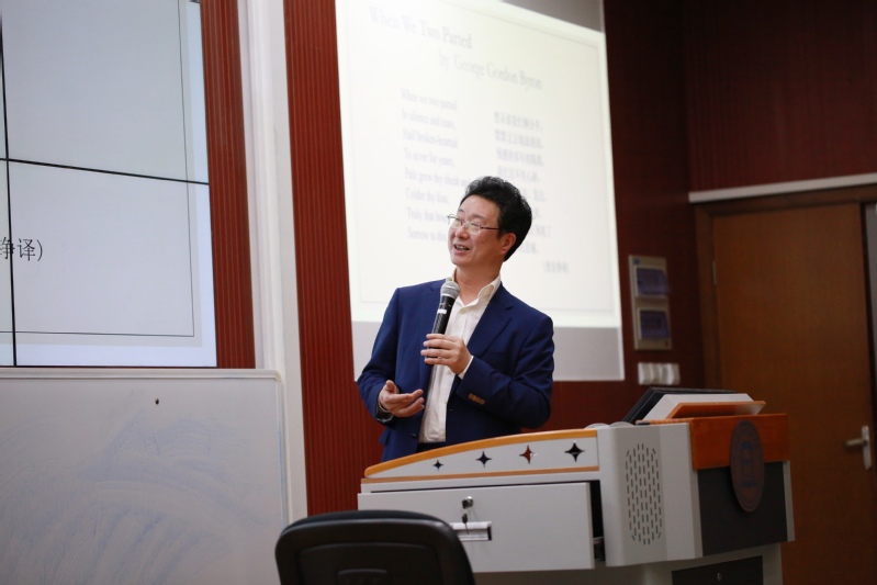 查教授以沈從文的“我行過許多地方的橋,看過許多次數(shù)的云,喝過許多種類的酒,卻只愛過一個(gè)正當(dāng)最好年齡的人”為引子,向在場(chǎng)師生講述了一些名人的愛情故事。他提出,文化不同,歷時(shí)環(huán)境不同,有各種愛情的表達(dá)。隨后,查教授以柳永的《雨霖鈴》和Robert Burns的A Red, Red Rose等為例闡述了中西愛情詩(shī)的不同特點(diǎn):中國(guó)詩(shī)委婉,西方詩(shī)直率;以魯迅的《傷逝》、陸游的《釵頭鳳》、沈從文的《邊城》、Jane Austen的Sense and Sensibility等中外名篇為例,解讀了中外文學(xué)中的傷逝主題;以林覺民的《與妻書》和Langston Hughes的Early Autumn等中外名篇為例,闡釋了中外文學(xué)中的“理智與情感”主題。《與妻書》作者林覺民在盡述夫妻至愛的同時(shí),暢敘了兒女情必須服從革命事業(yè)的至理,將一己之愛擴(kuò)展到普天下人志愛,表達(dá)了犧牲個(gè)人幸福,為天下人謀永福的崇高情懷。查教授通過縱向與橫向的比較,揭示了不同時(shí)期女性的愛情觀與婚姻觀的演變,以及女性獨(dú)立意識(shí)的逐漸增強(qiáng)。《傷逝》中女主人公子君和涓生的愛情悲劇說明五四時(shí)期青年女性不依附男性,追求經(jīng)濟(jì)獨(dú)立、維護(hù)獨(dú)立的形象和自尊的重要性。八十年代的文學(xué)作品則更倡導(dǎo)愛情中女性與男性的平等關(guān)系,舒婷的《致橡樹》正體現(xiàn)了這一點(diǎn)。查教授希望廣大青年學(xué)子多讀文學(xué)作品,達(dá)到理智與情感的平衡,樹立正確的愛情觀和婚姻觀,開拓心靈世界,更有智慧、更有情感地去生活。