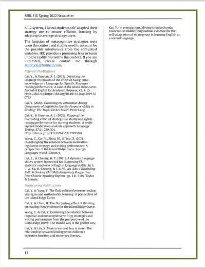 The function of metacognitive strategies rests upon the context and studies need to account for the possible interference from the contextual variables. IRC provides a promising lens to zoom into the reality blurred by the context. If you are interested, please contact me through sailor_cai@hotmail.com