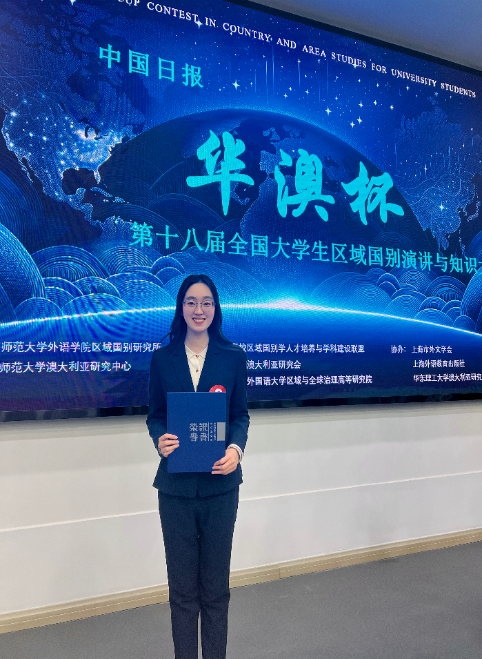 本次大賽由華東師范大學(xué)區(qū)域國(guó)別研究所和華東師范大學(xué)澳大利亞研究中心主辦,上海市外文協(xié)會(huì)、上海外語(yǔ)教育出版社以及華東理工大學(xué)澳大利亞研究中心協(xié)辦。大賽共分為三個(gè)部分:已備演講、即興演講和區(qū)域國(guó)別知識(shí)問答。已備演講以“China in the world”為主題,沈津雯同學(xué)見解獨(dú)到,引經(jīng)據(jù)典,展現(xiàn)出我院學(xué)子對(duì)百年未有之大變局的深切關(guān)注、對(duì)講好中國(guó)故事傳遞好中國(guó)聲音的充分理解;在僅有兩分鐘時(shí)間準(zhǔn)備的即興演講環(huán)節(jié),沈津雯同學(xué)與現(xiàn)場(chǎng)觀眾積極互動(dòng),自然流暢、侃侃而談,展現(xiàn)出家國(guó)情懷、全球視野和出色的應(yīng)變的能力;在區(qū)域國(guó)別知識(shí)問答部分,展示出豐富的知識(shí)儲(chǔ)備,獲得了現(xiàn)場(chǎng)專家評(píng)委的一致好評(píng)。