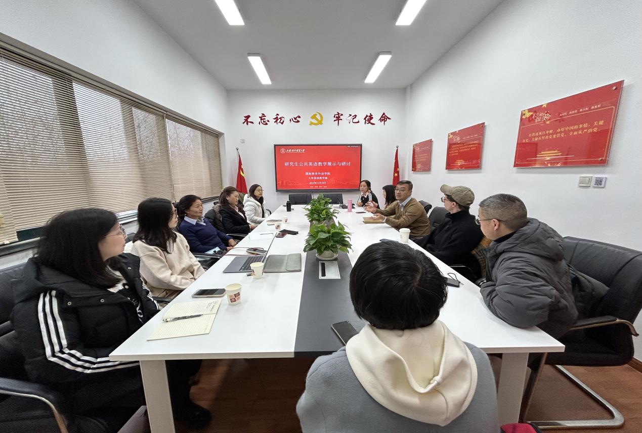 為加強《高級口語與寫作》、《博士英語》等研究生公共英語課程建設,增進授課教師之間的溝通與交流,以期進一步提高研究生公共英語教學質量,2023年12月19日下午,國際商務外語學院大學英語教學部與大學英語研究中心聯合在博雅樓304開展研究生公共英語教學展示與研討,旨在探索改革研究生公共英語教學方式,創新課程設置與教學模式,助力增強研究生的英語應用能力、實踐研究能力、學術研究能力和國際競爭力。本次活動由國際商務外語學院副院長單建國主持,教研室主任吳明會、課程負責人王春巖、新進教師張晨夏、張成成以及外教團隊的Cherry Zhang、Gabriella Yan、Justin Scott等參加了此次交流會。