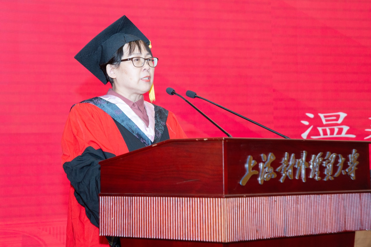 溫建平院長代表學院對2024屆研究生畢業生表示祝賀。溫院長在致辭中講到,同學們作為國家的建設者,是推進高水平對外開放、建設貿易強國的生力軍,是實現中華民族偉大復興的先鋒力量,鼓勵同學們與國同夢、為國分憂,在新時代的廣闊天地里,求實求真、大氣大為。她提出三點希望,一是希望同學們不負時代,用青春書寫理想;二是希望同學們不改本色,用大愛承載天下;三是希望同學們不忘初心,用實踐傳承精神。