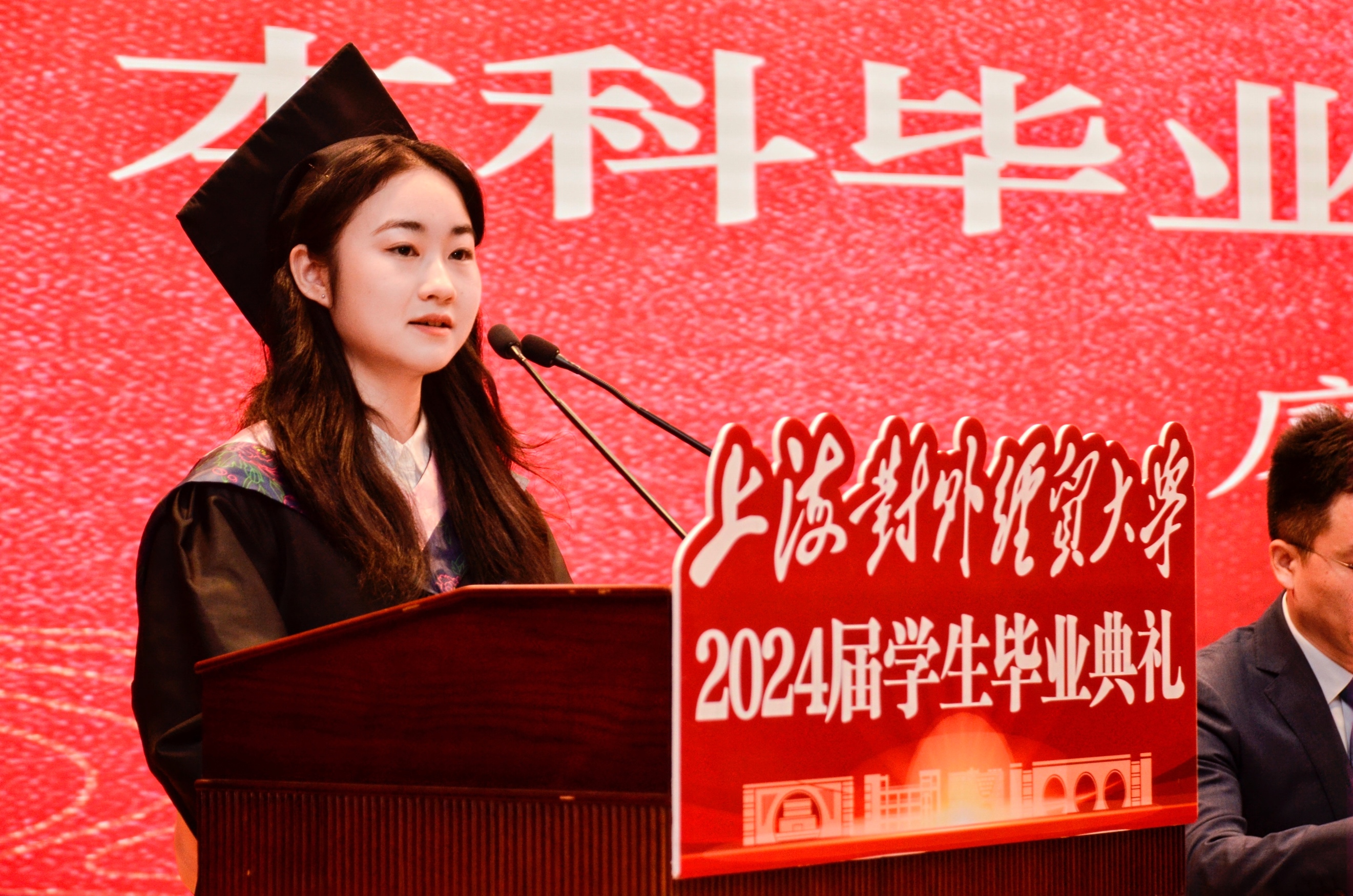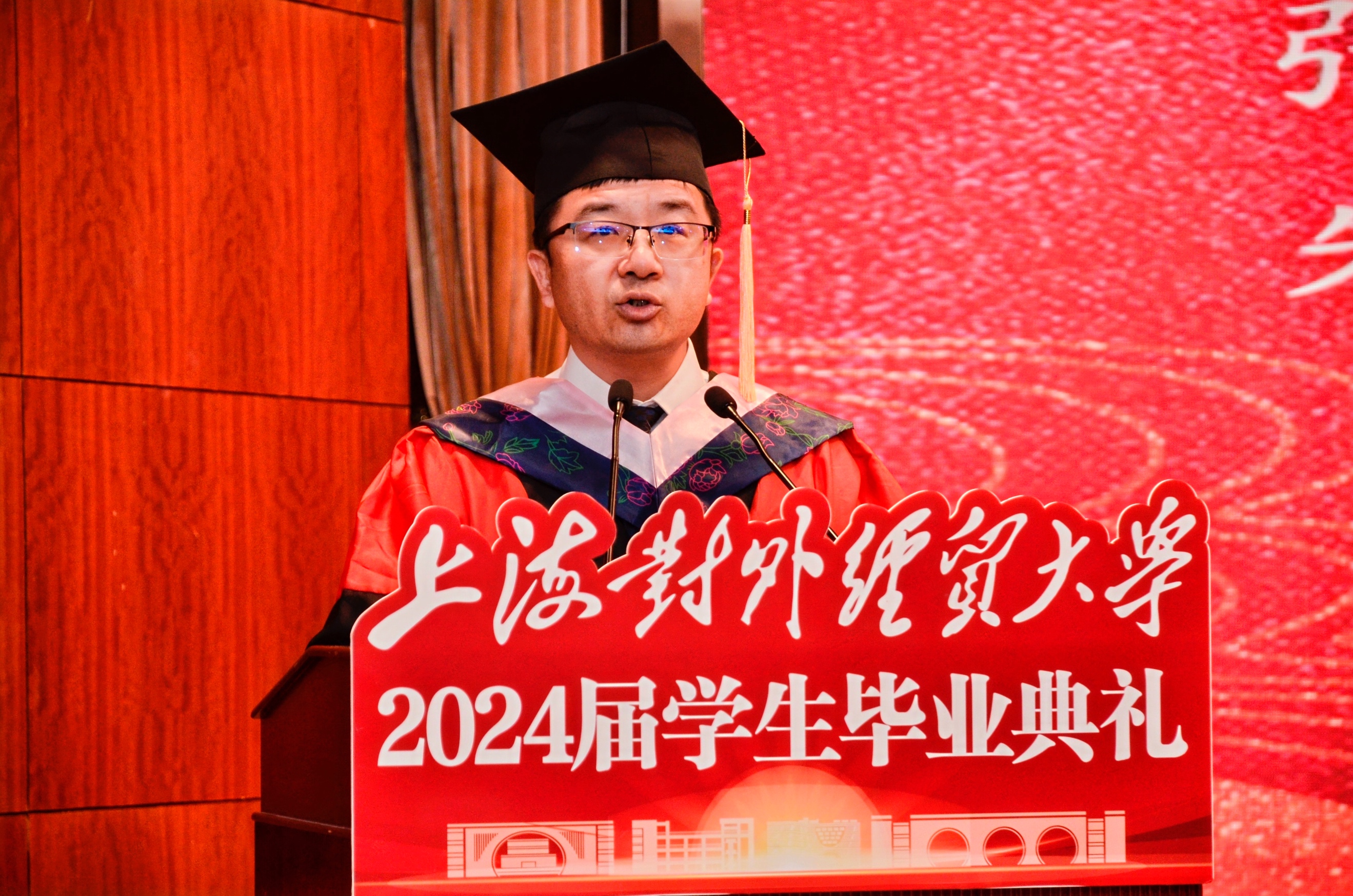 校友代表代智松(2006屆本科畢業生,現任嘉吉集團道德與合規部總監)發言。他回顧了自己離開校園后的成長和奮斗歷程,表達了對母院的深深敬意,并囑咐畢業生們順流而進,把握時代的脈搏,成為行業的佼佼者;逆流而上,勇于面對挑戰,不斷超越自我,展現出上經貿大人的風采,為社會的繁榮和進步貢獻力量。
