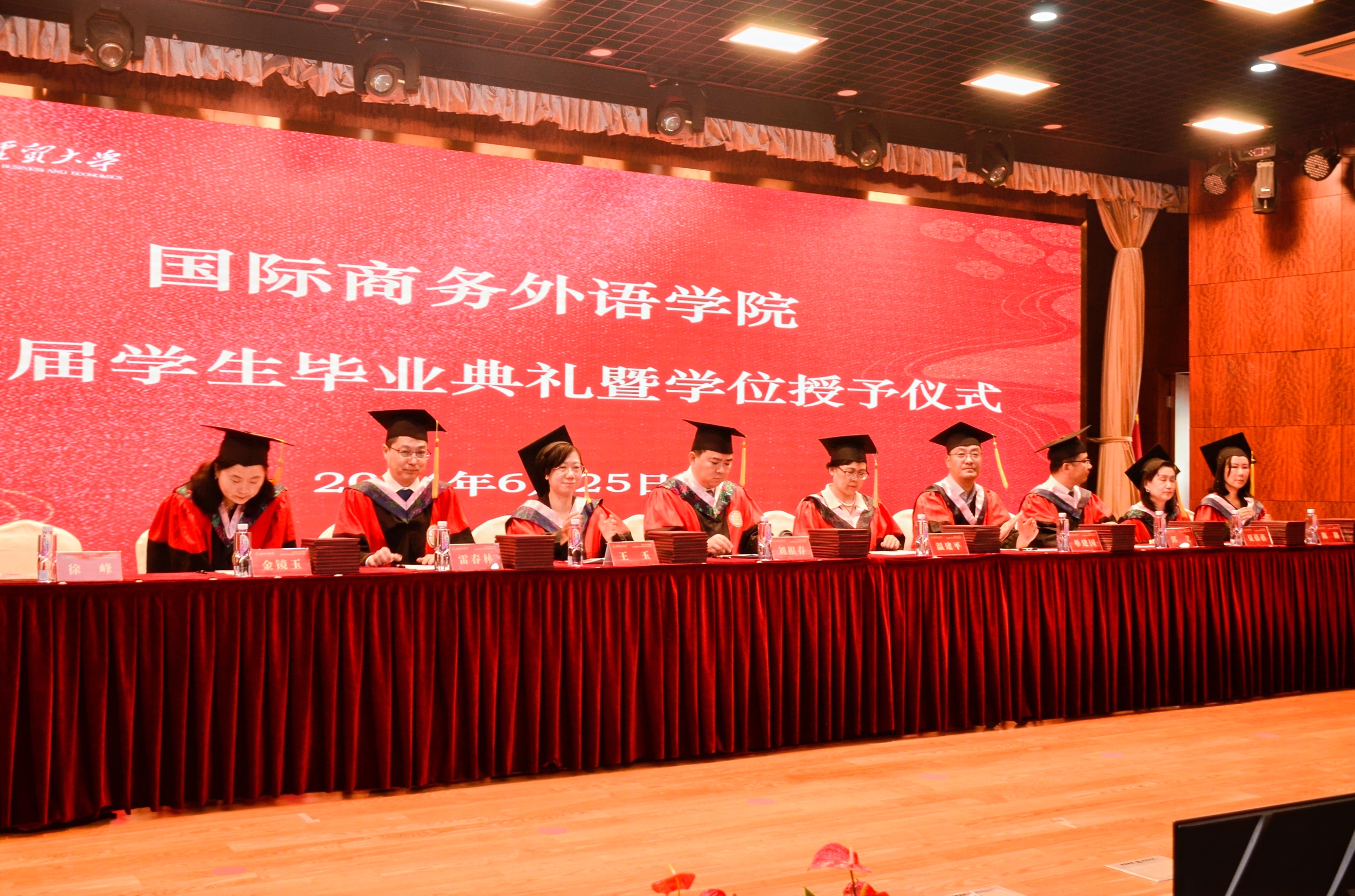 6月25日上午,國際商務外語學院2024屆學生畢業典禮暨學位授予儀式在信息樓507報告廳隆重舉行。學院黨委書記劉根春,院長溫建平,副院長王玉、單建國、郭義、雷春林,各學位點負責人,專任教師代表,研究生導師代表,校友代表,畢業班輔導員,2024屆本碩畢業生以及家長代表參加儀式。儀式由學院黨委副書記徐峰主持。