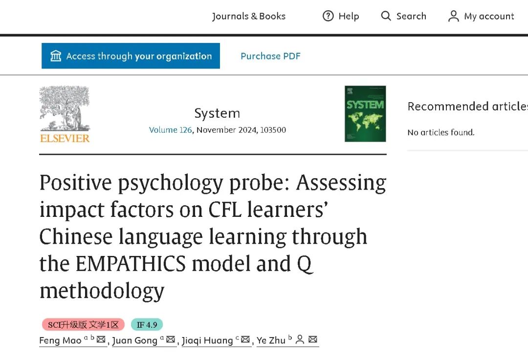 近日,我院毛鋒副教授以第一作者身份在國際語言學領域Top期刊System(最新影響因子為4.9,中國科學院人文科學領域SSCI一區期刊)上發表了題為“Positive psychology probe: Assessing impact factors on CFL learners’Chinese language learning through the EMPATHICS model and Q methodology”的論文。這一成果是毛鋒副教授繼2024年獲得國家社科基金中華學術外譯項目后又一重要學術成果。這項研究聚焦漢語作為外語學習者的心理因素,為語言教育研究提供了新的視角,充分展現了學院教師的跨學科研究實力。