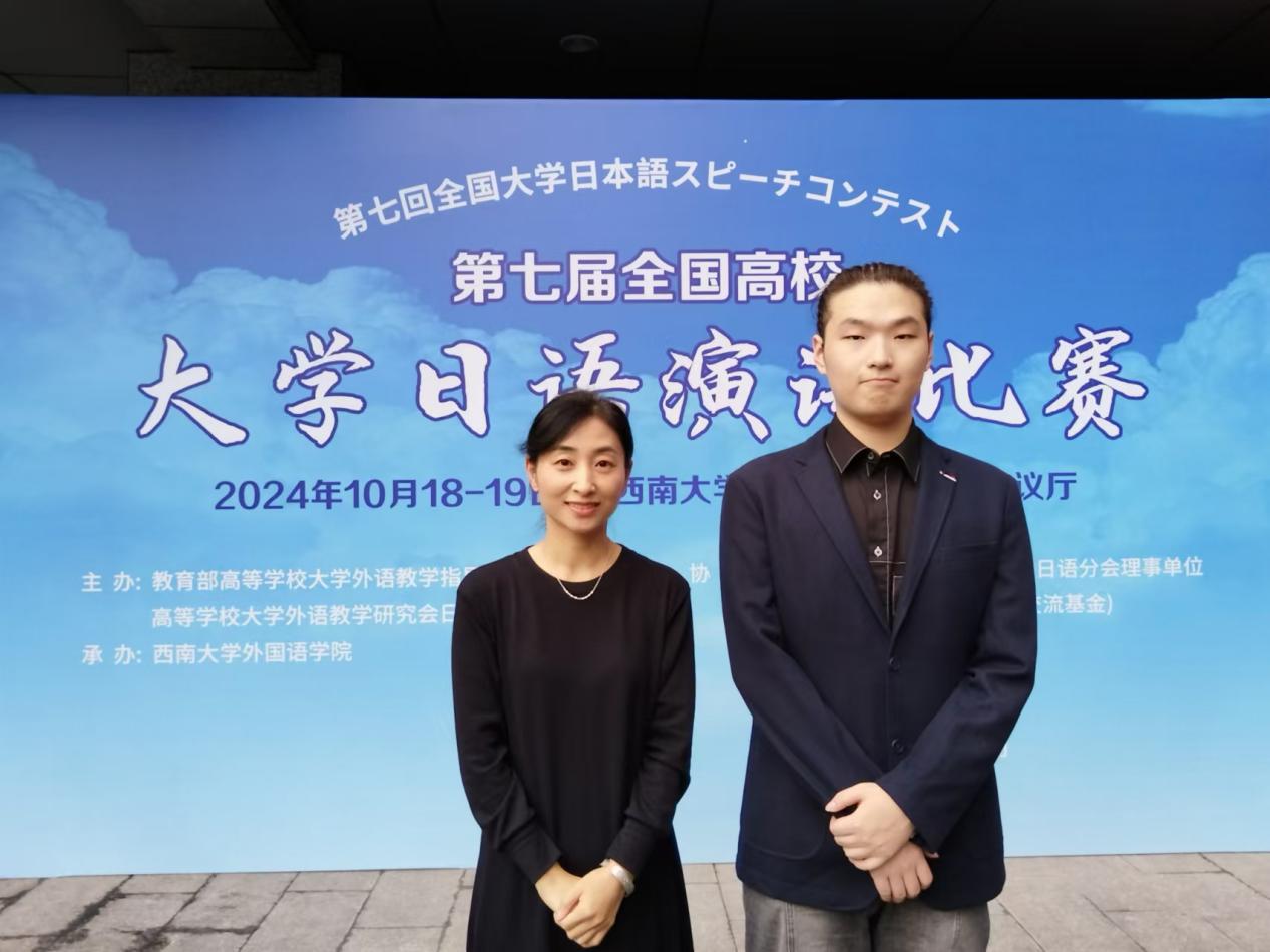 2024年10月19日,第七屆全國高校日語演講比賽在西南大學舉辦。我校2022級國際貿易專業學生唐爍陽表現突出,榮獲特等獎,指導教師日語系李波老師榮獲“優秀指導教師”稱號。這是繼2022年和2023年我校學生在該賽事中連續獲得全國二等獎之后的又一次突破。