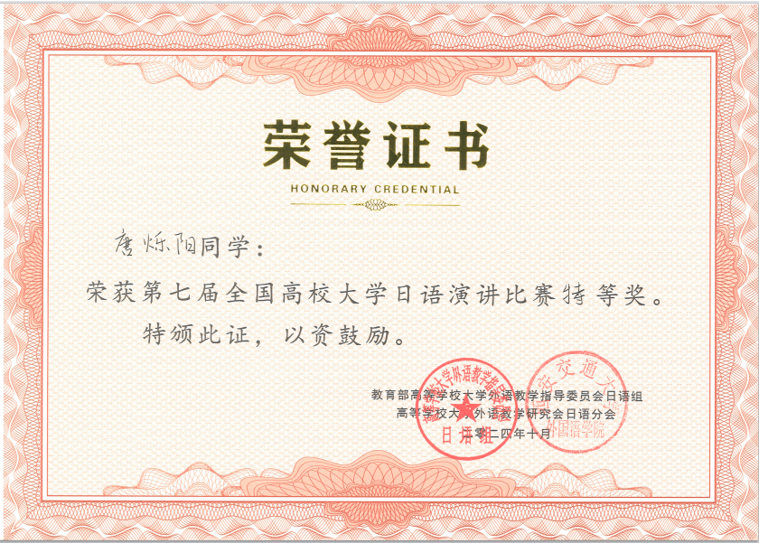 本屆比賽吸引了全國55所高等院校的積極參與,經過激烈角逐,共有35所高校成功晉級決賽。唐爍陽同學在上午的命題演講和下午的即興演講兩個環節中表現出色,最終憑借其卓越的日語口語表達能力榮獲特等獎。