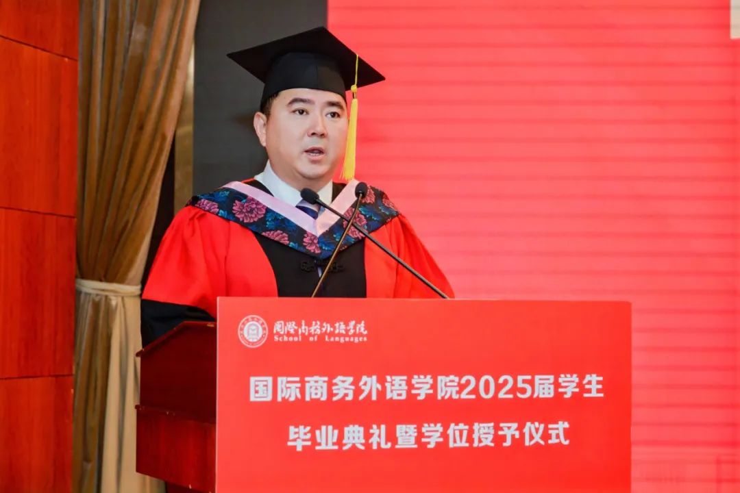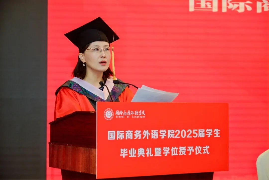 張蔚磊代表學院向圓滿完成學業的2025屆畢業生表示熱烈祝賀,并向關心培育學生成長的親友和師長致以誠摯敬意。她在講話中提到,當下新一輪科技革命與產業變革加速演進,中國正以更開放的姿態參與全球治理,站在新的歷史方位,強國建設與民族復興的宏偉藍圖亟待青年一代接續奮斗。她對同學們提出三點希望:一是希望同學們格物致知,在文明互鑒中找準價值錨點,在實踐的理性分析和價值判斷中,“格”跨文化之“物”,“致”全球勝任力之“知”。二是希望同學們融通創新,在智能時代淬煉核心優勢,通過DeepThink解讀文本背后的文化內涵;通過DeepSink把握文明演進的內在邏輯;通過DeepCreate在語言與科技的共生進化中,重新定義外語人的時代坐標。三是希望同學們胸懷家國,在時代征程中開拓人生疆界,自覺將個人追求與民族復興同頻共振,在服務國家高水平對外開放和上海城市高質量發展的實踐中貢獻青春智慧、實現人生價值。