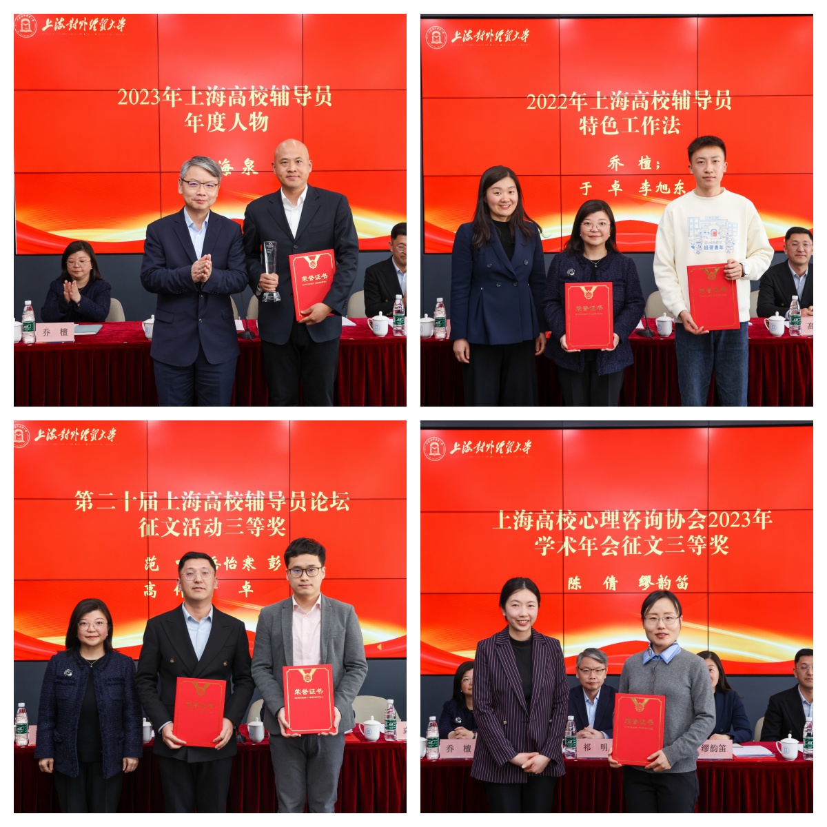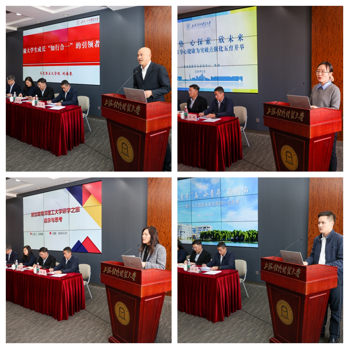 在會議交流發(fā)言環(huán)節(jié)中,馬克思主義學(xué)院黨總支副書記(主持工作)劉海泉、工商管理學(xué)院黨委副書記張瑞娟、學(xué)校心理健康教育中心教師陳倩、統(tǒng)計與信息學(xué)院輔導(dǎo)員肖包興邦分別以《做大學(xué)生成長“知行合一”的引領(lǐng)者》《新加坡南洋理工大學(xué)研學(xué)之旅啟示與思考》《新形勢 心探索 欣未來》《“大青年”與“小青年”的煩惱——基于人工智能未來發(fā)展的一些思考》為題作主題匯報。