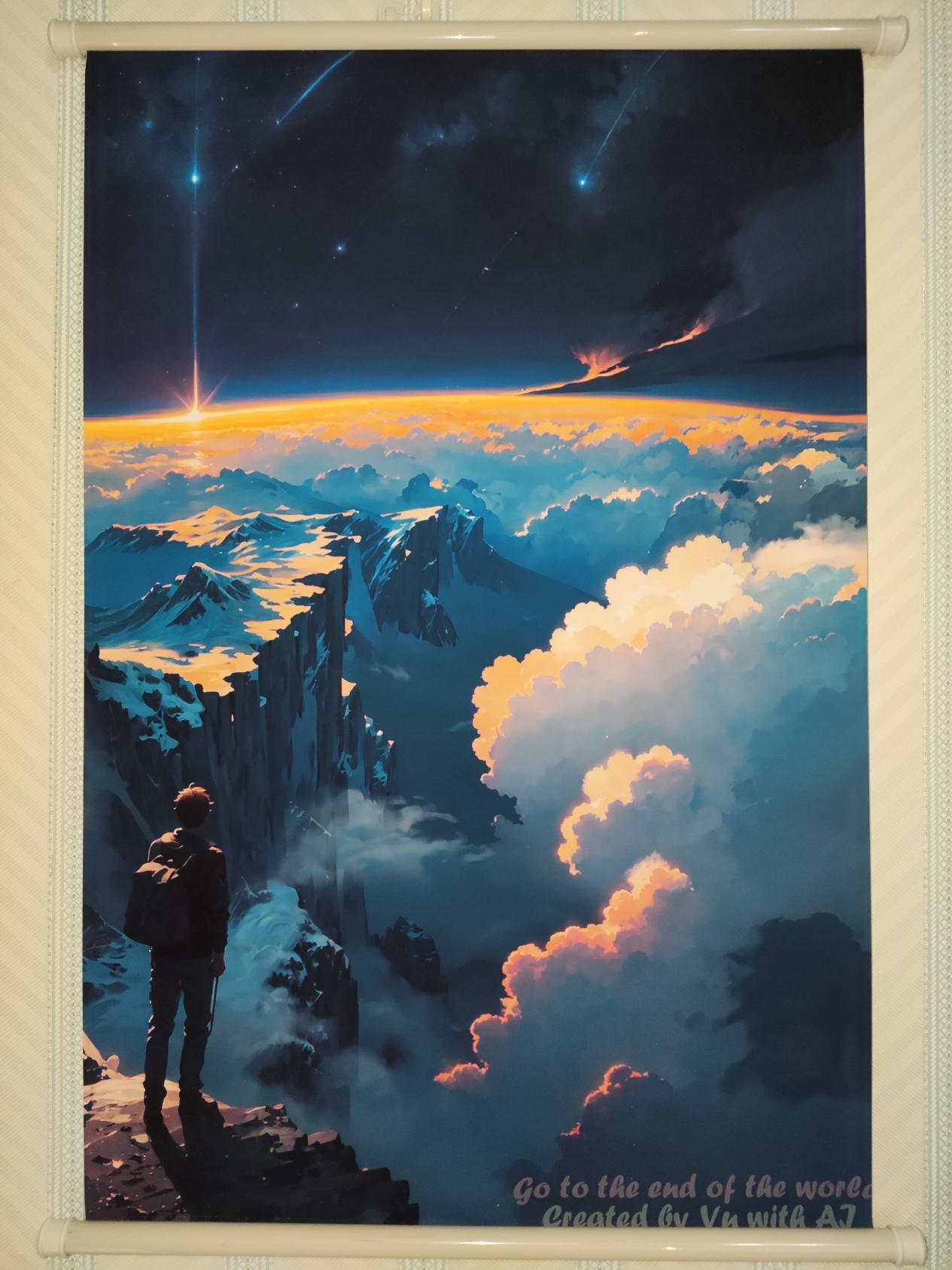 在畫作之中,背對著少年登上這世界上最高的山峰,仿佛站在了地球之外,遙看地平線,流星在空中劃過,在繁星點點之下,初升的太陽產生奪目的耀光,把云層染成夢幻的霞色。層層夢幻的景象襯托出少年的雄心壯志:“Go to the end of the world”。這幅畫作用于向父母言說自己的熱血與理想,傾訴潛藏在內心的冒險精神與青春浪漫。