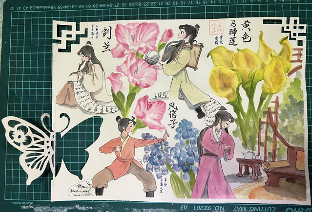畫面中的人物便都設計為身著漢服,黃色馬蹄蓮,花語為尊敬、愛戴,送與父母,感謝他們的支持陪伴;劍蘭,花語為不斷進步、步步高升,送給將要邁入大學的自己,祝愿自己學業有成;風信子,花語為享受豐富人生,同樣送與自己,意在希望自己在上海對外經貿大學度過愉快、充實的的大學時光。