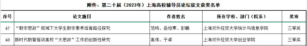 近日,上海市教委工作黨委、市教委公布了第二十屆(2023年)上海高校輔導員論壇征文獲獎名單。經學校推薦、專家評審、綜合評定等多個環節,我校統計與信息學院范鳴、岳怡寒、彭鵬撰寫的《“數字思政”視域下大學生數字素養培育路徑探究》,創業學院高偉、國際經貿學院于卓撰寫的《新時代數智驅動高校“大思政”工作的創新性研究》脫穎而出,榮獲三等獎。