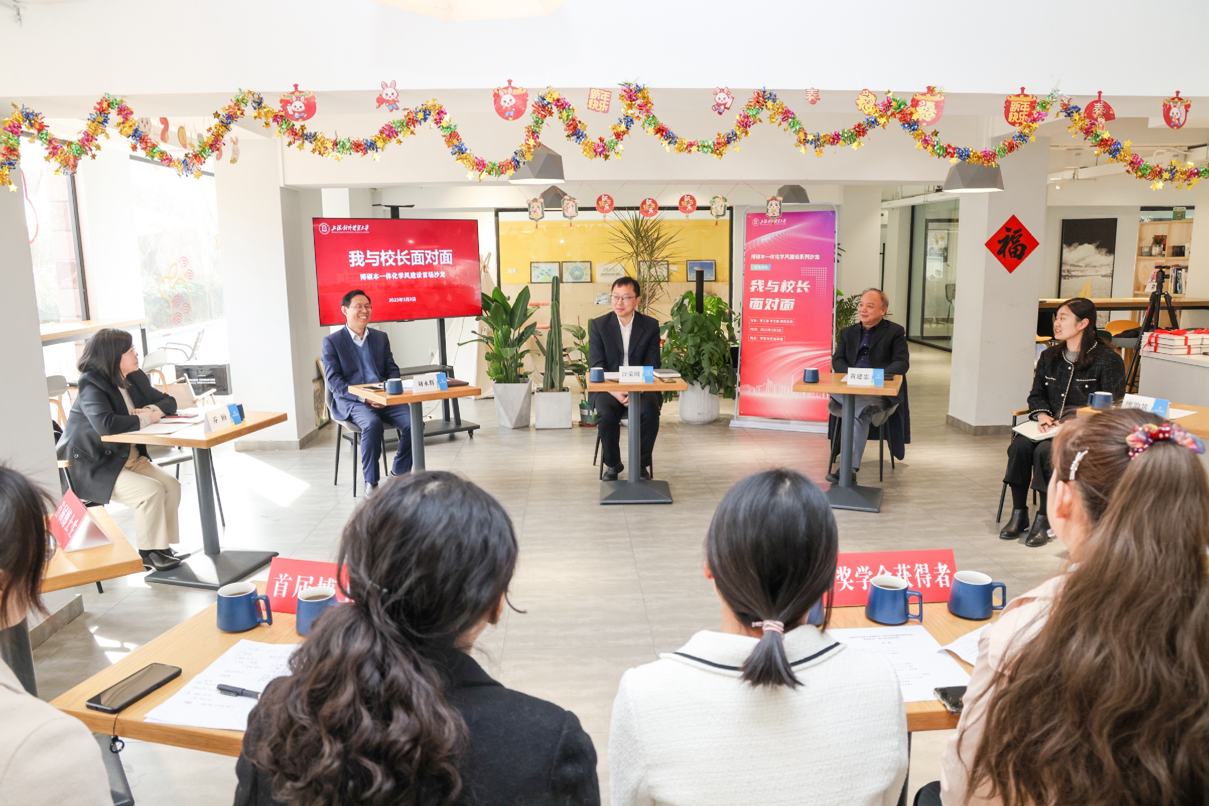 3月3日下午,學(xué)校在“一站式學(xué)生社區(qū)”創(chuàng)享家舉辦了博碩本一體化學(xué)風(fēng)建設(shè)系列沙龍的首場活動“我與校長面對面”。校長汪榮明、WTO亞太培訓(xùn)中心主任黃建忠、研究生院院長劉永輝出席活動,首屆校長獎學(xué)金獲得者和首屆博士生參加了沙龍,活動由黨委學(xué)(研)工部部長繆韻笛主持。