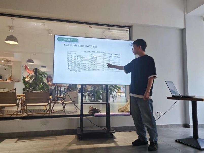國際組織學院(貿易談判學院)在讀博士生宋喜志通過“WTO與國際貿易理論”對WTO框架進行了梳理。他通過鮮活的案例,生動地引入了比較優勢理論,為同學們揭示了國際貿易的基石。他詳細闡述了世界貿易組織的建立過程,以及非歧視原則在維護國際貿易公平中的核心作用。在貨物貿易領域,他深入剖析了關稅壁壘和非關稅壁壘對國際貿易的影響,并介紹了貿易救濟制度的重要性。