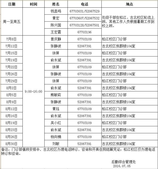 后勤綜合管理處2016年暑期值班安排