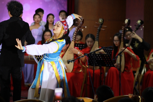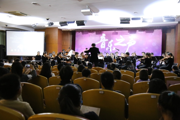 音樂會上,現場的師生欣賞了一場精彩紛呈的聽覺盛宴。民樂團以《春節序曲》的節選片段開場,將全場氛圍帶入新春佳節的濃濃年味之中。十大歌手返場演唱《存在》,默契演繹清麗的和聲,于淺吟低唱中爆發猛烈的情感。語藝團別出心裁,用四川方言重塑的《再別康橋》讓人眼前一亮,給觀眾們帶來了新奇的體驗。上海口琴會的老藝術家們用精湛的技藝帶來了《舊友進行曲》、《花兒與少年》等經典曲目,專業的演出引得現場掌聲不斷。合唱團、西洋樂團也分別為觀眾們傾情奉獻了精彩的演出。現場驚喜連連,高潮不斷。最后,新年音樂會在《音樂之聲》的悠揚樂音中圓滿落幕。