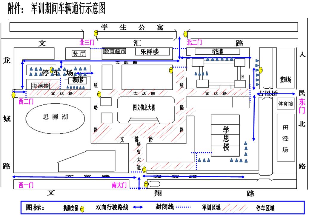 1、軍訓期間,所有機動車輛均從西門和北二門、南門、東門按照附件一的指示路線通行。