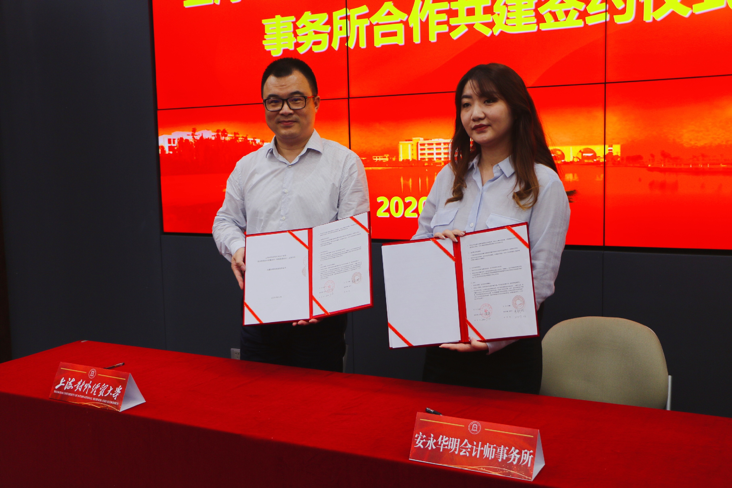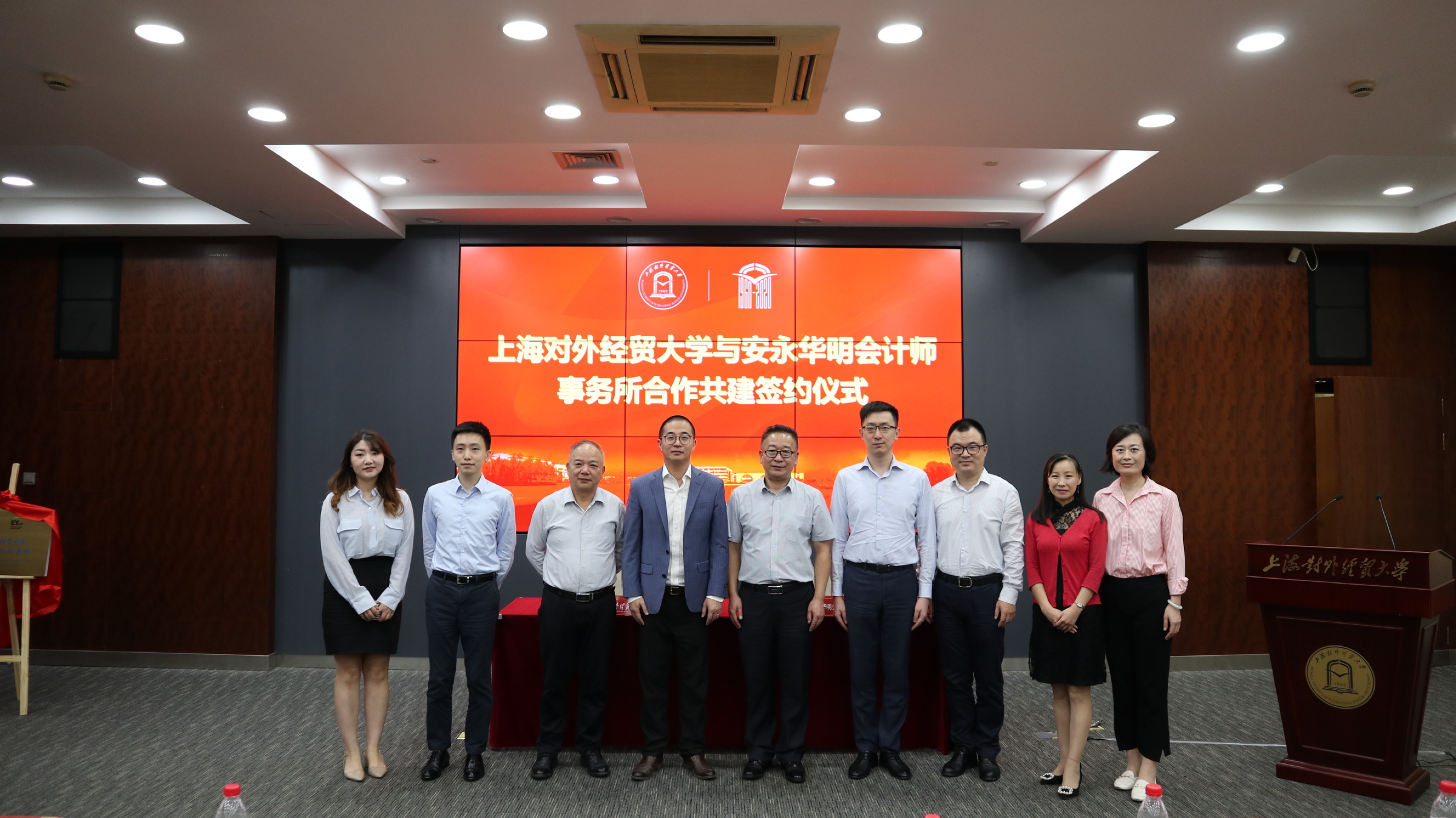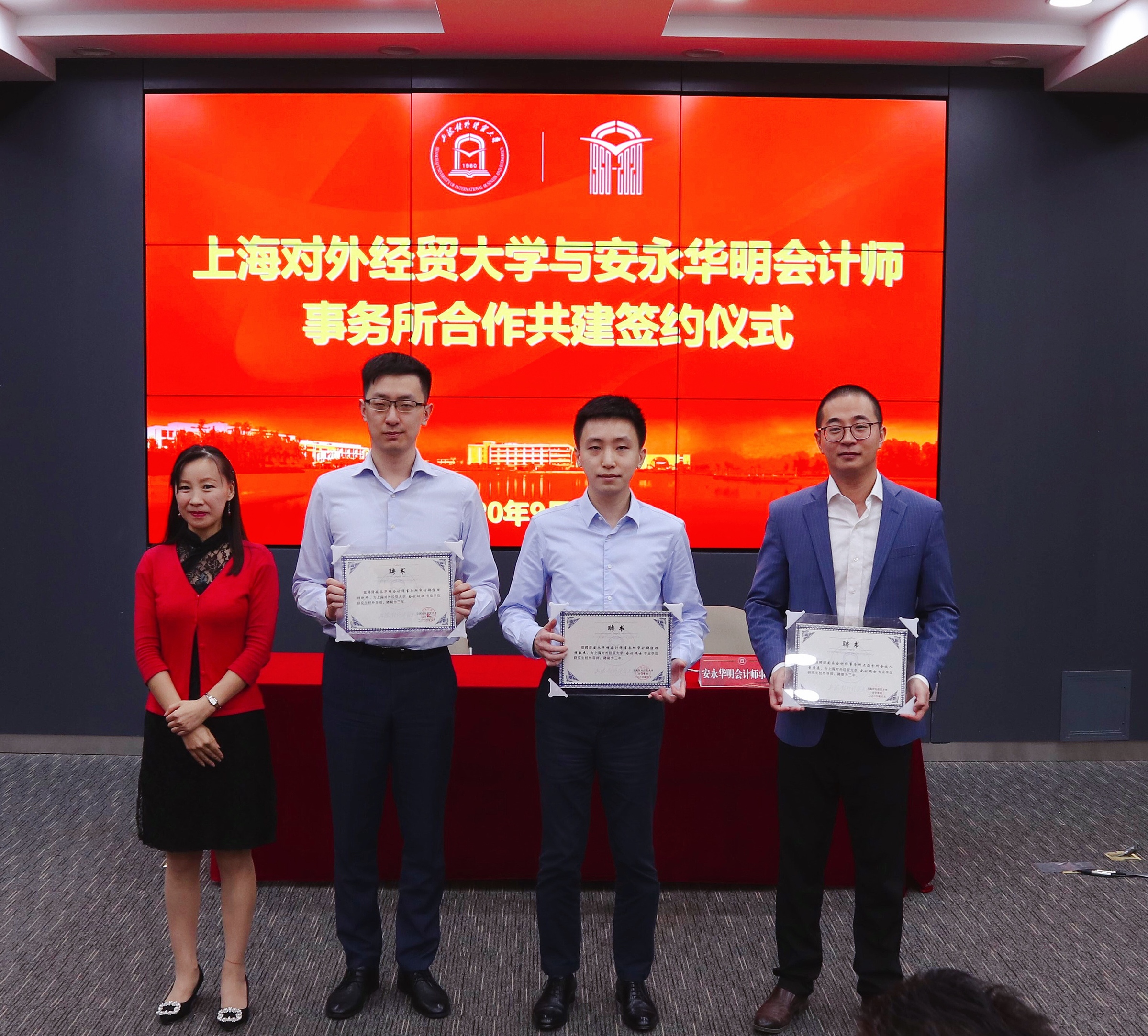 談華與李新玥分別代表校企雙方簽署了“共建長期實踐基地”協(xié)議書。研究生院院長黃建忠與董彥亮共同為“上海對外經(jīng)貿(mào)大學(xué)會計學(xué)院實踐基地”揭牌。