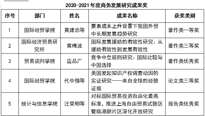 近日,由商務部組織的“商務發展研究成果獎”(2020-2021年度)評選結果揭曉,我校5項成果獲商務部“商務發展研究成果獎”,獲獎數量創歷年之最,共獲得一等獎1項、三等獎2項、優秀獎2項。學校國際經貿學院黃建忠教授研究團隊成果獲得一等獎。