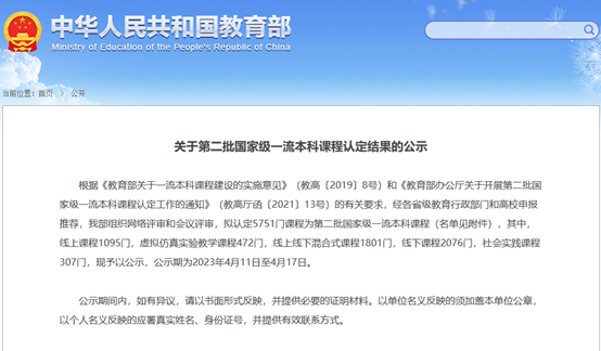近日,教育部印發(fā)了《關(guān)于第二批國家級一流本科課程認(rèn)定結(jié)果的公示》,擬認(rèn)定5751門課程為第二批國家級一流本科課程。