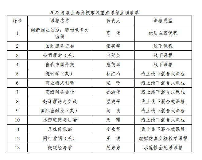近日,上海市教委發(fā)布了《上海市教育委員會關于公布2022年度上海高校市級重點課程立項名單的通知》(滬教委高〔2022〕27號),我校申報的《創(chuàng)新創(chuàng)業(yè)創(chuàng)造:職場競爭力密鑰》等13門課程全部獲得立項。其中,優(yōu)質(zhì)在線課程1門,線下課程3門,線上線下混合式課程7門,虛擬仿真實驗教學課程1門,示范性全英語課程1門。