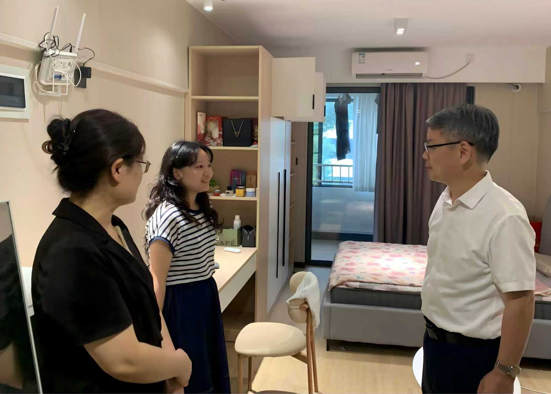 在新教師公寓樓內,祁明一行先后走進公寓臥室、客廳、廚房及公共活動區域,仔細查看家具配置、水電供應、網絡覆蓋、消防安全設施等情況,詳細詢問公寓日常管理服務、衛生保潔、維修響應效率等細節問題。每到一處,他都認真傾聽現場工作人員的情況介紹,對公寓整體居住條件和環境維護給予了肯定,并提出了進一步優化改善的建議和舉措。