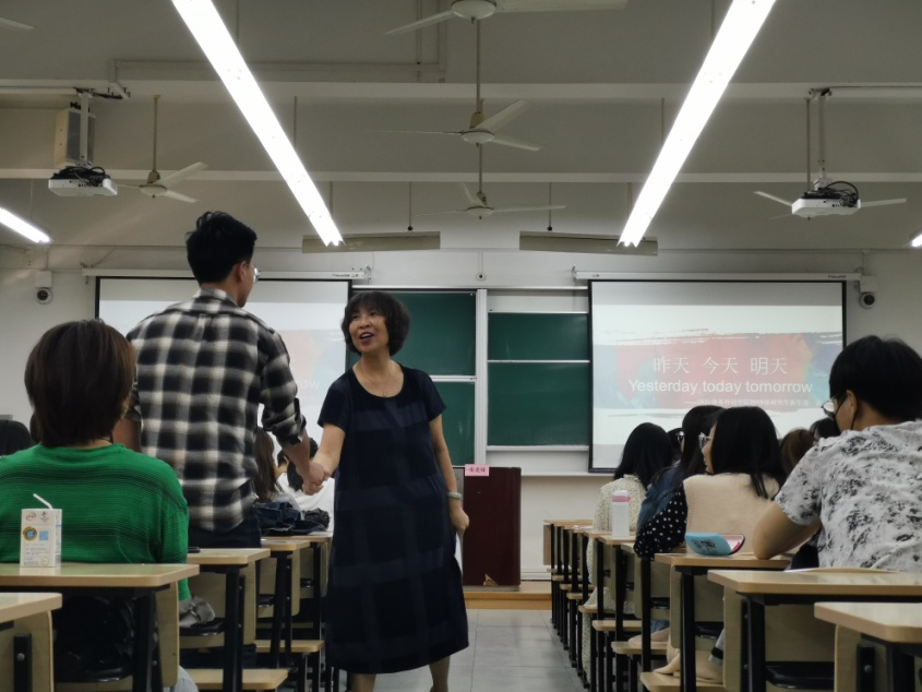 朱龍妹老師全程英文講座,期間與新生們親切互動,朱老師先送給了大家三個詞:昨天 今天 明天。昨天已經是白駒過隙,今天尚在手中,明天卻是無法預測,因此老師對于大家未來兩年多的學習生活希望能提出一些建議。